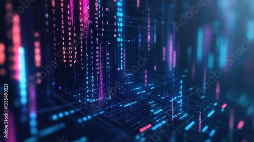 The watermark will not be included on Wall mural.: Futuristic digital matrix with glowing blue and pink binary code in virtual data network