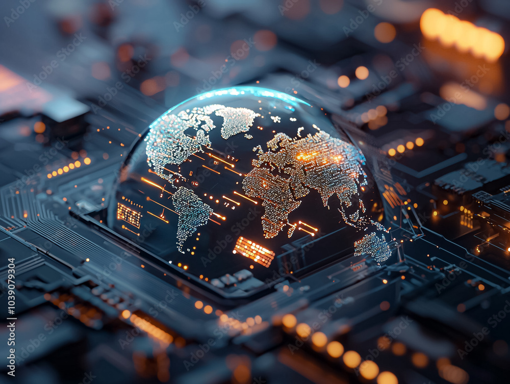 Wall mural : Futuristic digital network background with fiber optics and binary code representing global technolo