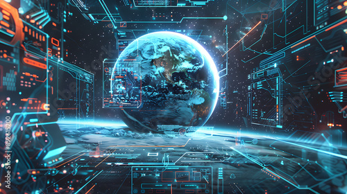 Wall mural futuristic digital planet earth space global map technology starry cosmic atmosphere data neural net