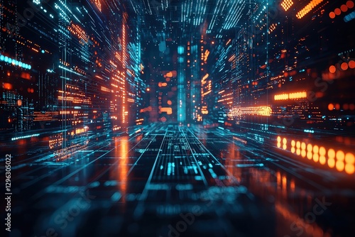 Wall mural futuristic digital space with glowing data stream and neon lights in 3d perspective visualization
