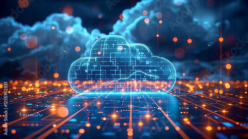 Wall mural : Futuristic digital technology concept with glowing cloud and circuit patterns in a cybernetic space