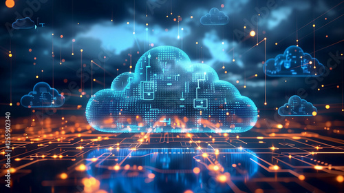 Wall mural : Futuristic digital technology concept with glowing cloud network over a circuit board background
