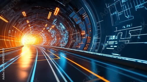 Wall mural futuristic digital tunnel with glowing lines and light source