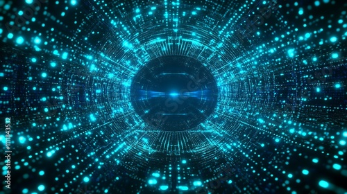 Wall mural : Futuristic digital tunnel with glowing particles and light rays in technology background