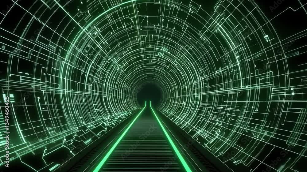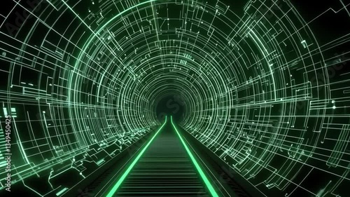 Wall mural futuristic digital tunnel with neon green lights and circuit pattern for technology and sci-fi conce