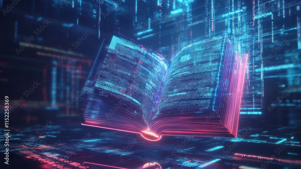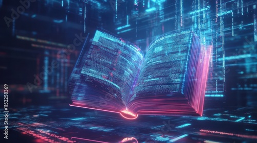 Wall mural : Futuristic glowing book levitating in a digital space filled with data streams and code -