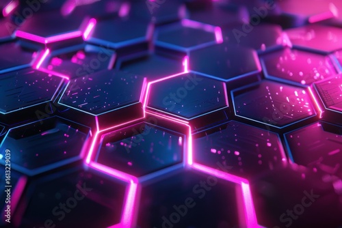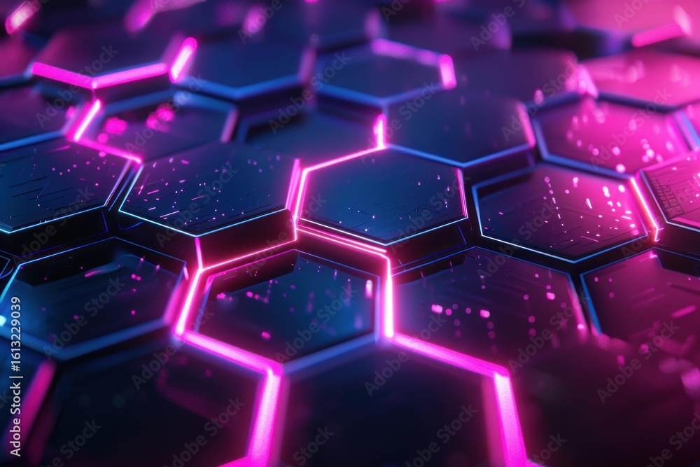 Wall mural futuristic glowing neon pink and blue hexagonal pattern creating a technological and digital backgro