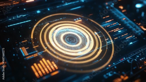 Futuristic glowing orange and blue head up display with charts and graphs is processing dataWall mural