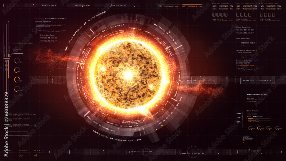Futuristic graphic user interface head up display screen with digital holographic nuclear fusion eneWall mural