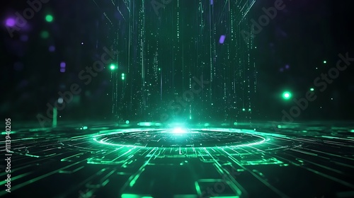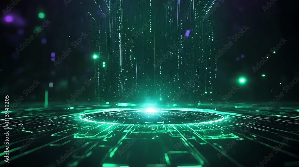 Wall mural : Futuristic green data stream with vertical lines and glowing circles in dark digital environment