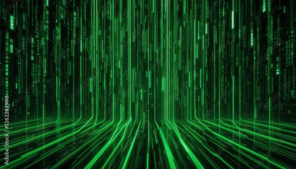 The watermark will not be included on Wall mural.: Futuristic green digital matrix with vertical lines and binary code