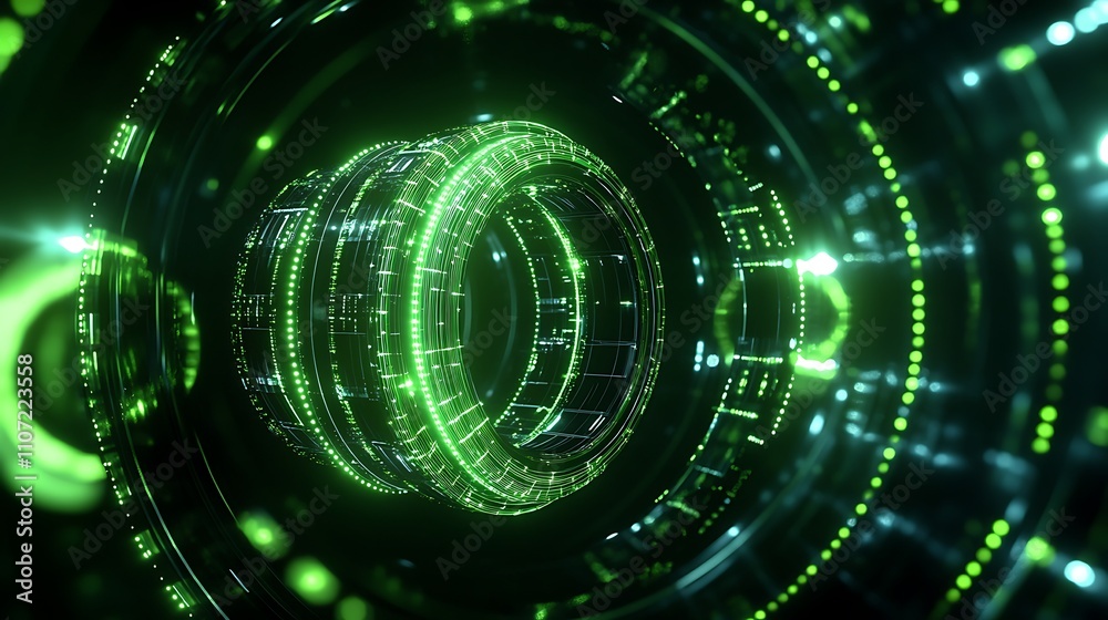 The watermark will not be included on Wall mural.: Futuristic green technology background with circular patterns and digital lines in a dark environmen