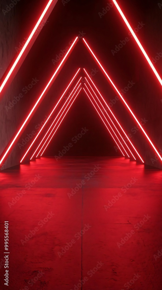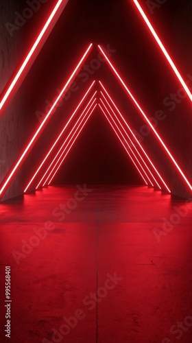 The watermark will not be included on Wall mural.: Futuristic hallway featuring vibrant red neon lights with sharp triangular shapes, creating a striki