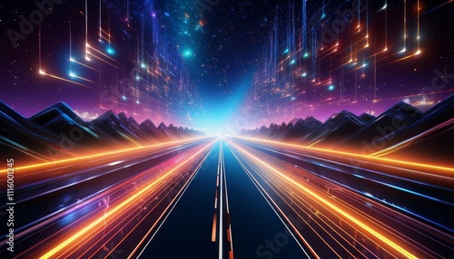 Wall mural futuristic highway scene with a sleek road stretching into digital space featuring glowing lines and - Wall murals Wall mural futuristic highway scene with a sleek road stretching into digital space featuring glowing lines and - Wall murals