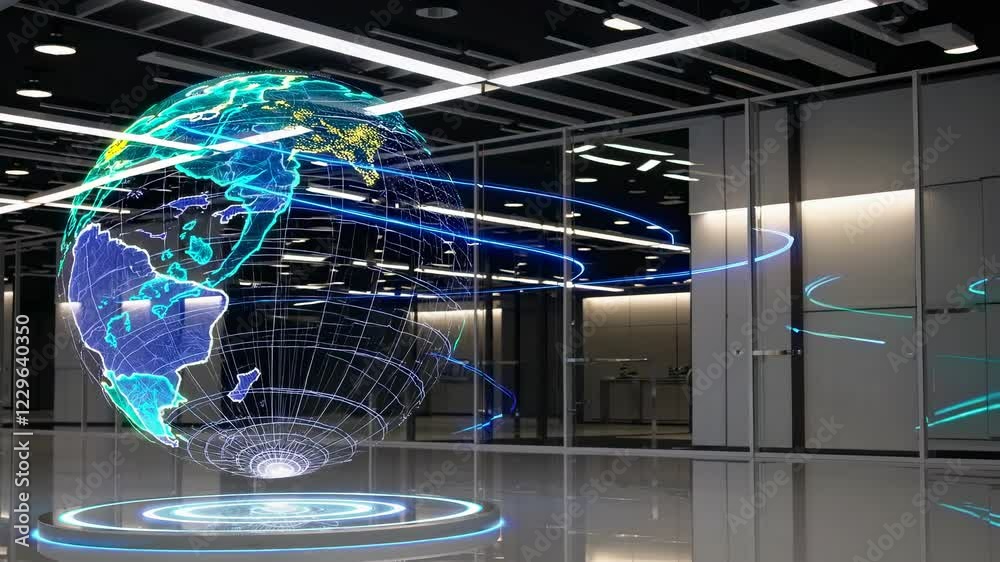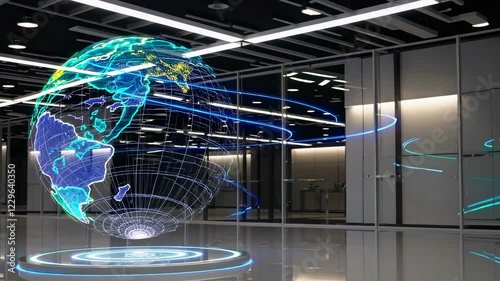 Wall mural : Futuristic hologram display of earth in modern office setting featuring advanced vfx and hud element