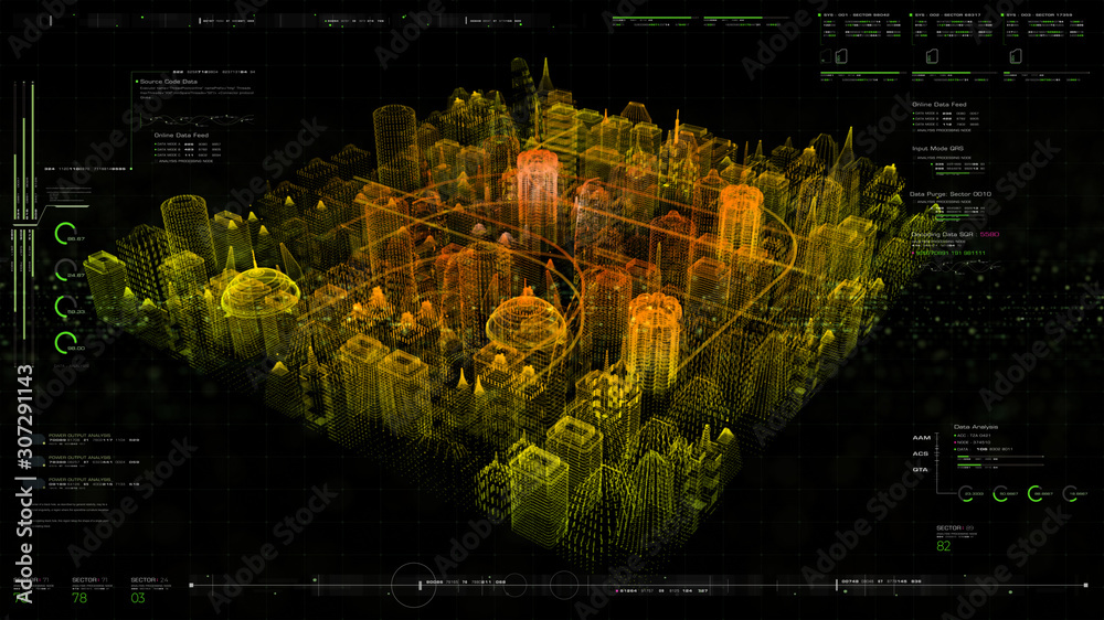 Wall mural : Futuristic holographic city digitally generated image virtual reality matrix particles in cyber spac