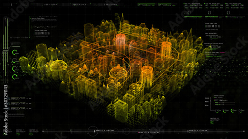 Wall mural futuristic holographic city digitally generated image virtual reality matrix particles in cyber spac