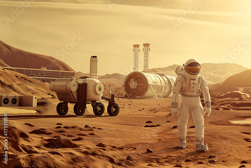 The watermark will not be included on Wall mural.: Futuristic human base on mars - mars rover and spaceman with cutting-edge design, mars bases and a ro