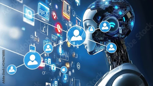 Wall mural : Futuristic humanoid robot profile adorned with digital elements and icons representing communication