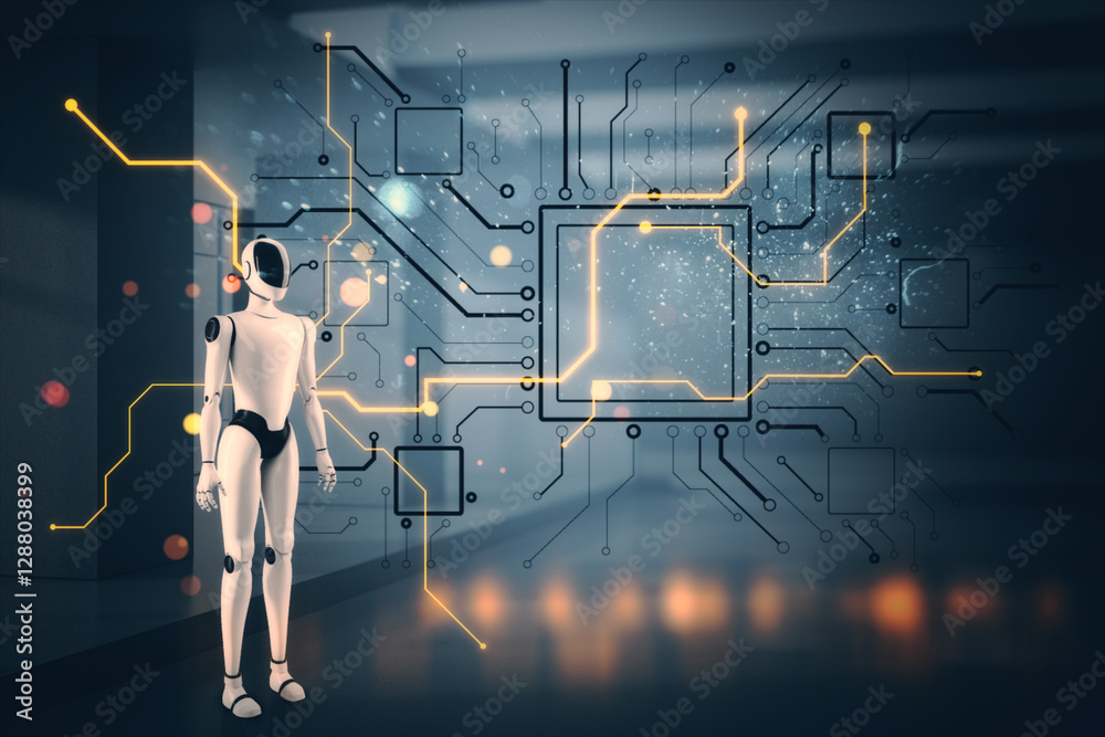 The watermark will not be included on Wall mural.: Futuristic humanoid robot with glowing circuit board connections in a modern high-tech environment -