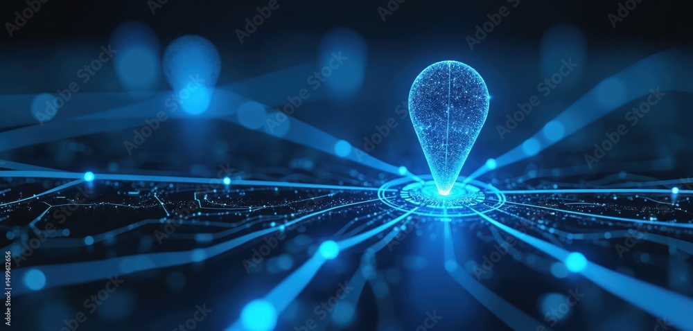 Wall mural futuristic illustration blue glowing location pins on map with one pin highlighted. connected lines  - Wall murals Wall mural futuristic illustration blue glowing location pins on map with one pin highlighted. connected lines - Wall murals