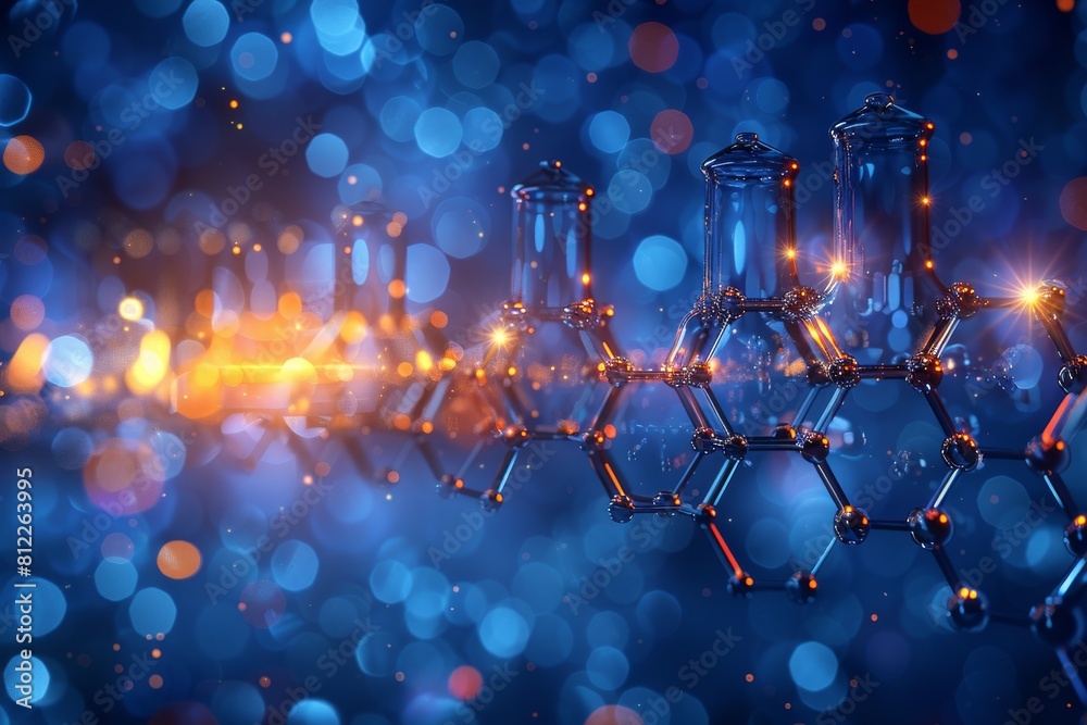 Wall mural futuristic image featuring laboratory glassware with illuminated connection lines amid a sparkling b - Wall murals Wall mural futuristic image featuring laboratory glassware with illuminated connection lines amid a sparkling b - Wall murals