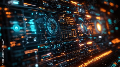 Wall mural futuristic interface, complex data display, dark room, network activity in background. possible use  - Wall murals Wall mural futuristic interface, complex data display, dark room, network activity in background. possible use - Wall murals
