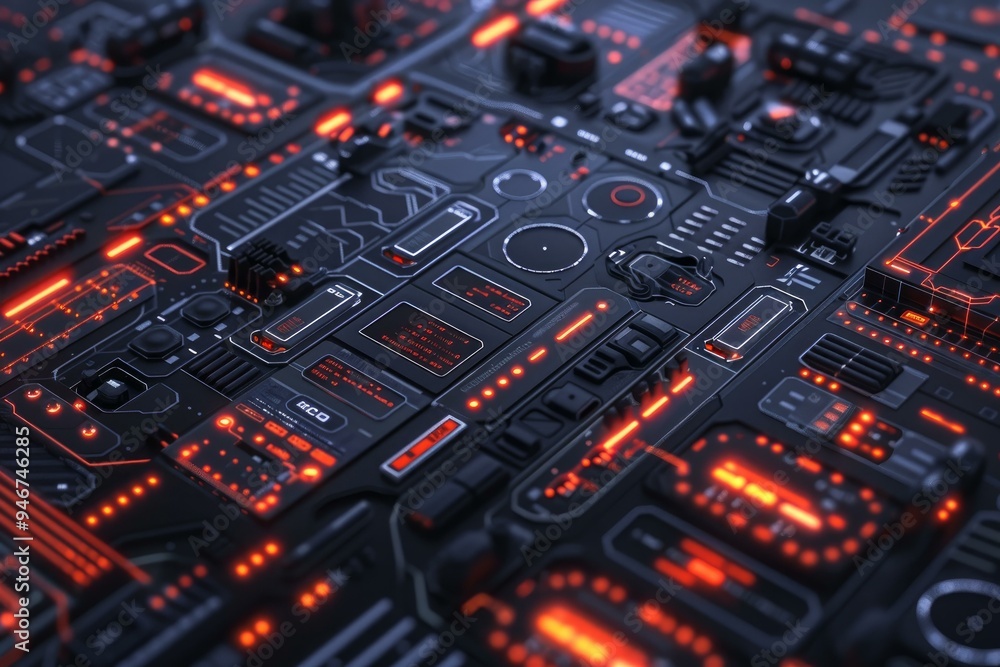 Wall mural futuristic interface is showing complex data analysis in orange and black - Wall murals Wall mural futuristic interface is showing complex data analysis in orange and black - Wall murals