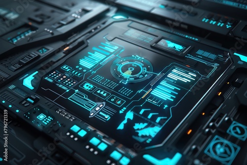 Wall mural : Futuristic interface with a detailed circuit diagram illuminated in blue, featured on a minimalist g