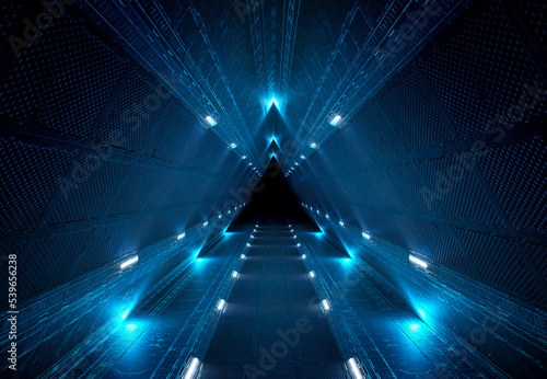 Wall mural futuristic interior corridor with blue neon lights walls. triangle shaped spaceship background in sp