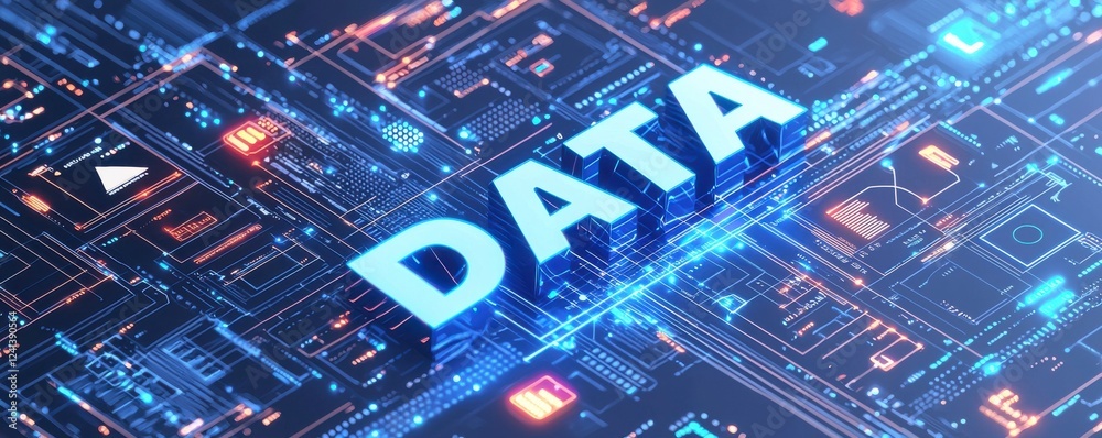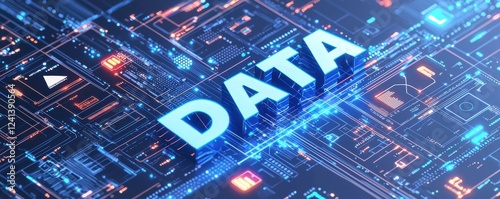 The watermark will not be included on Wall mural.: Futuristic isometric data visualization concept with glowing digital interfaces