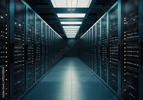 The watermark will not be included on Wall mural.: Futuristic it data center corridor with glowing server racks and illuminated ceiling lights, ideal f