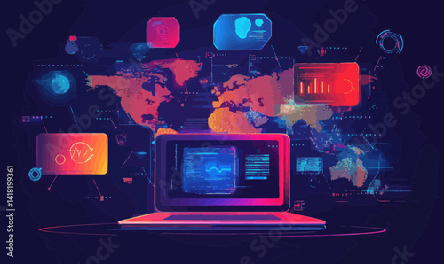 Wall mural : Futuristic laptop with digital network visualization and world map background for tech innovation