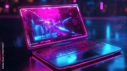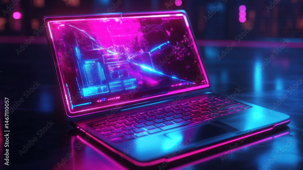 Futuristic laptop with vibrant neon glow displaying data streams on its screen - Wall mural