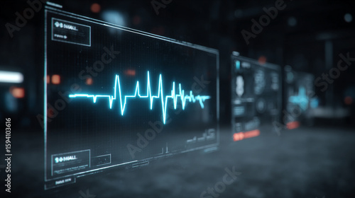 Futuristic medical background with glowing cyan heart rate graph pulsing on a dark digital screen - i