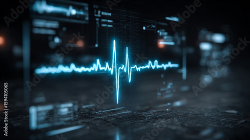 Futuristic medical background with glowing cyan heart rate graph pulsing on a dark digital screen - i