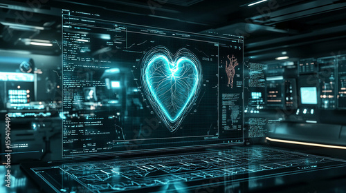 Futuristic medical background with glowing cyan heart rate graph pulsing on a dark digital screen - i