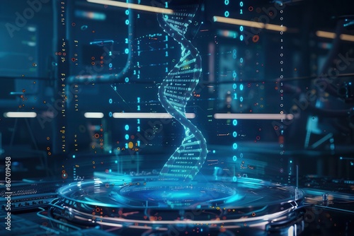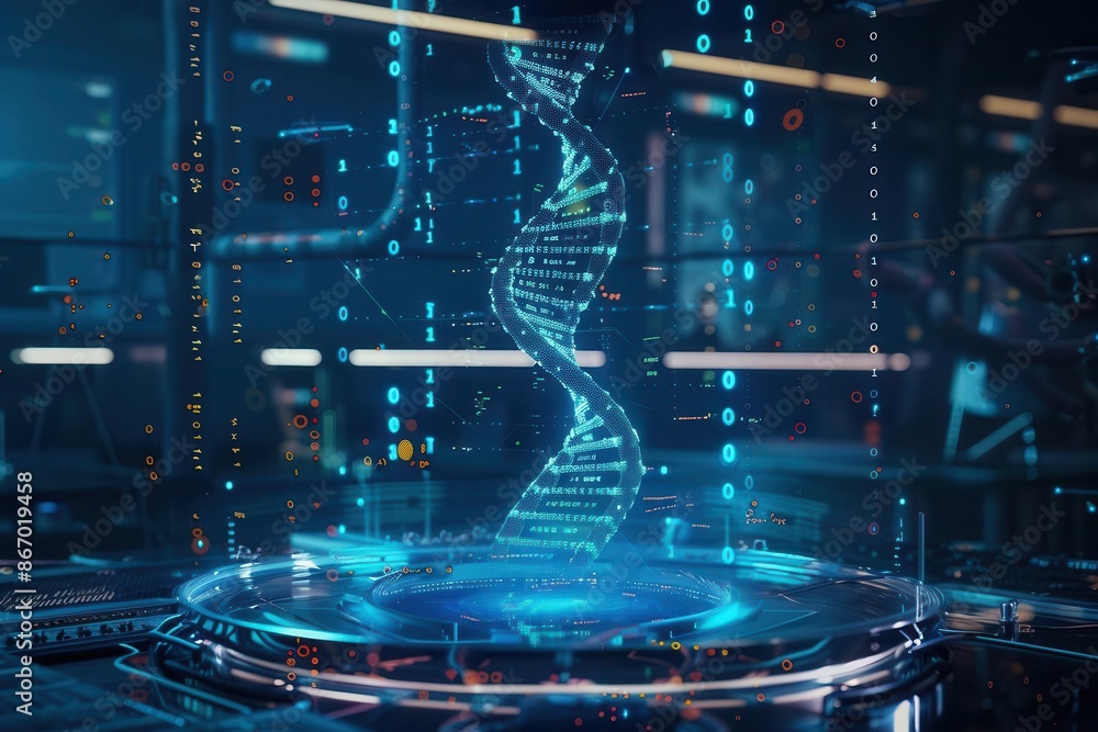 Wall mural futuristic medical hologram displaying a 3d dna helix surrounded by floating data points and genetic