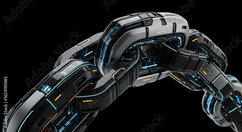 The watermark will not be included on Wall mural.: Futuristic metallic chain links glowing with blue light on a black background creating a modern tech