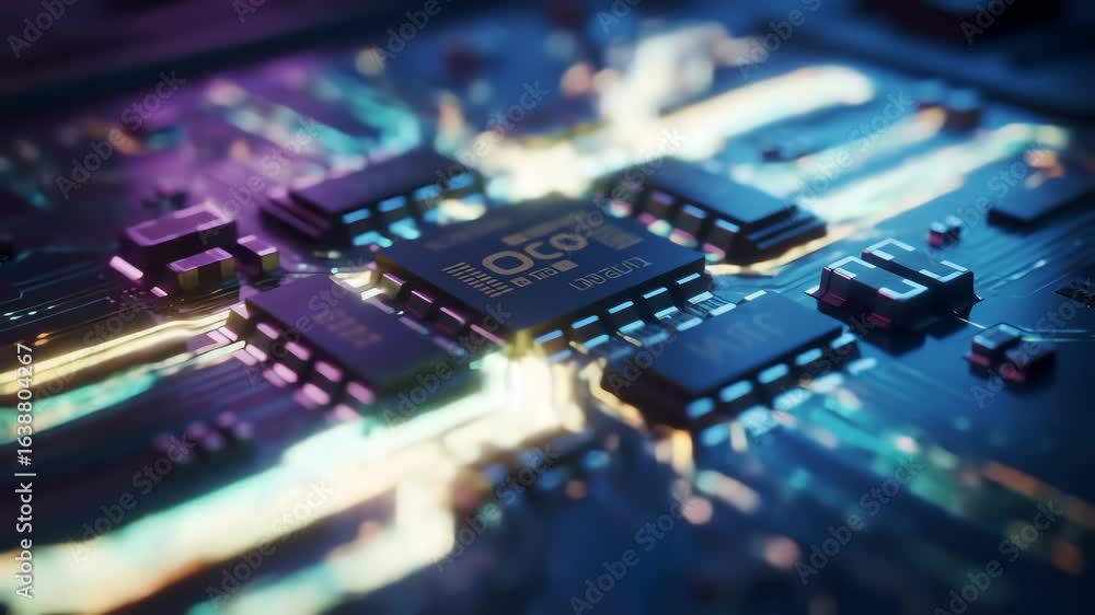 Futuristic microprocessor on an electronic circuit board with glowing data pathwaysWall mural