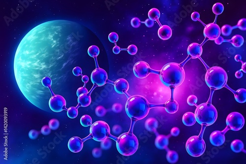 The watermark will not be included on Wall mural.: Futuristic molecules float in deep space with a distant planet in the background - sci-fi themed digi