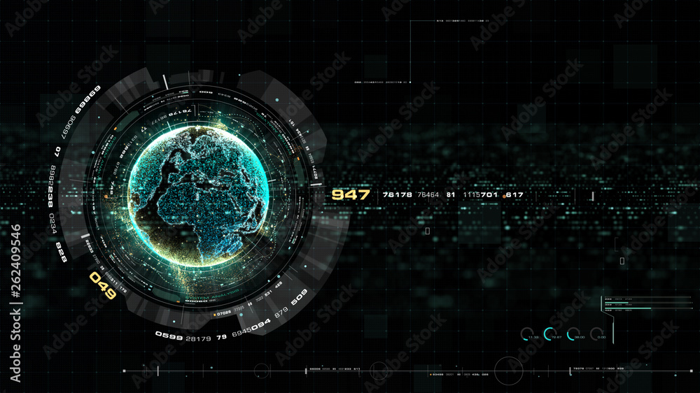 Futuristic motion graphic user interface head up display screen with holographic earth and digital dWall mural