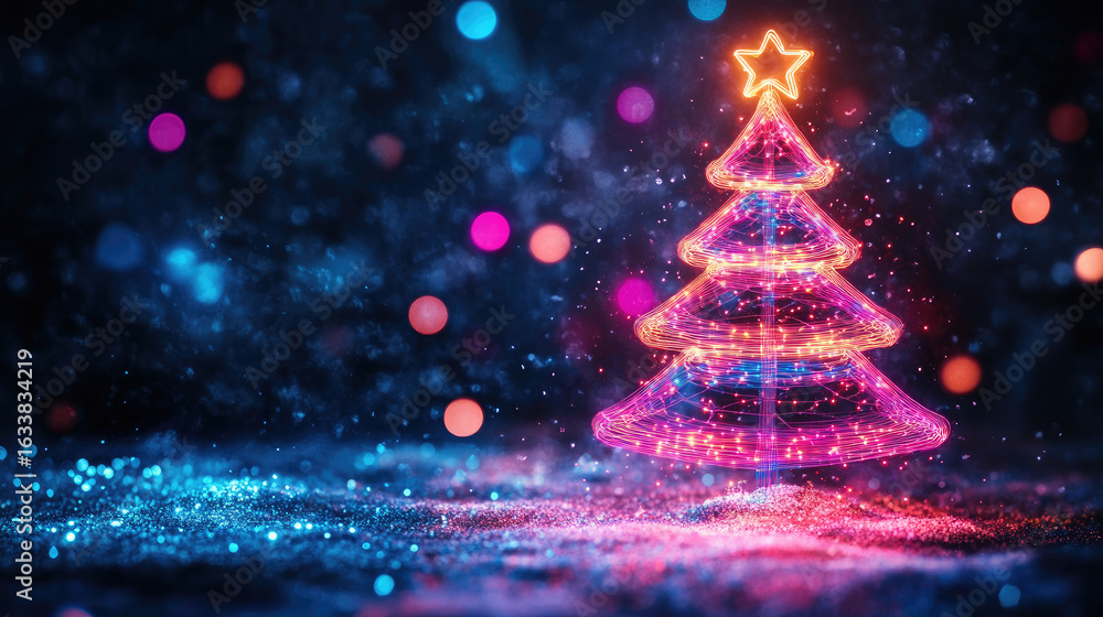 Wall mural futuristic neon christmas tree on glowing background with empty space for text or product display, p - Wall murals Wall mural futuristic neon christmas tree on glowing background with empty space for text or product display, p - Wall murals