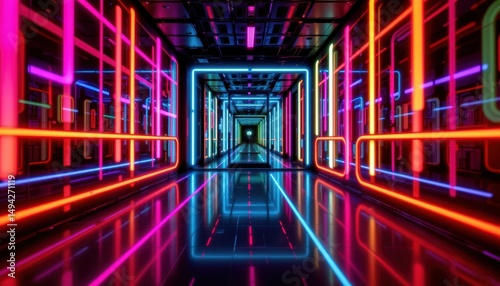 The watermark will not be included on Wall mural.: Futuristic neon tunnel with reflection and vibrant lights creating a colorful abstract space