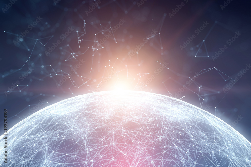 Futuristic network data globe with lines and dots - view from space - selective focus used - Wall mural