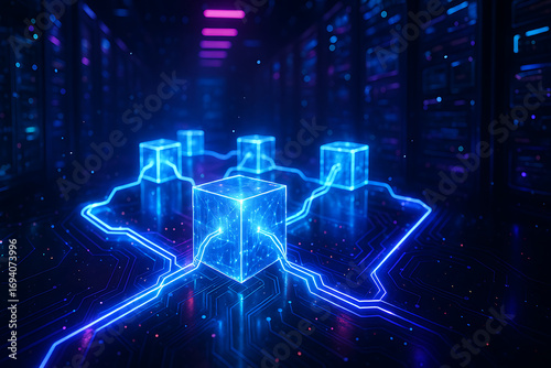 Wall mural : Futuristic network of glowing blue cubes representing blockchain data processing in an abstract serv
