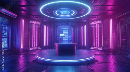 The watermark will not be included on Wall mural.: Futuristic sci-fi room with neon lights and platform -
