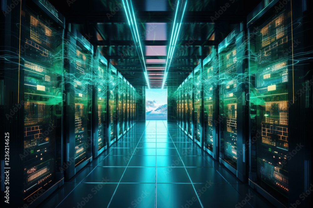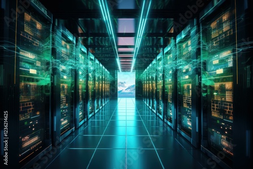Wall mural futuristic server room data center showing green digitalization and cloud computing - Wall murals Wall mural futuristic server room data center showing green digitalization and cloud computing - Wall murals