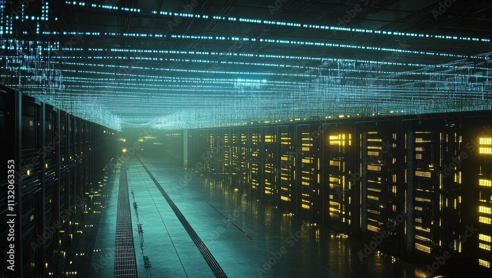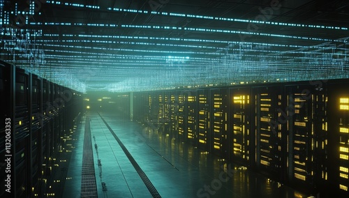 Wall mural futuristic server room with data streams.
