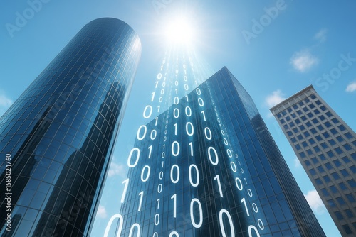 Wall mural futuristic skyscrapers with binary code and sunlight, symbolizing digital transformation and innovat